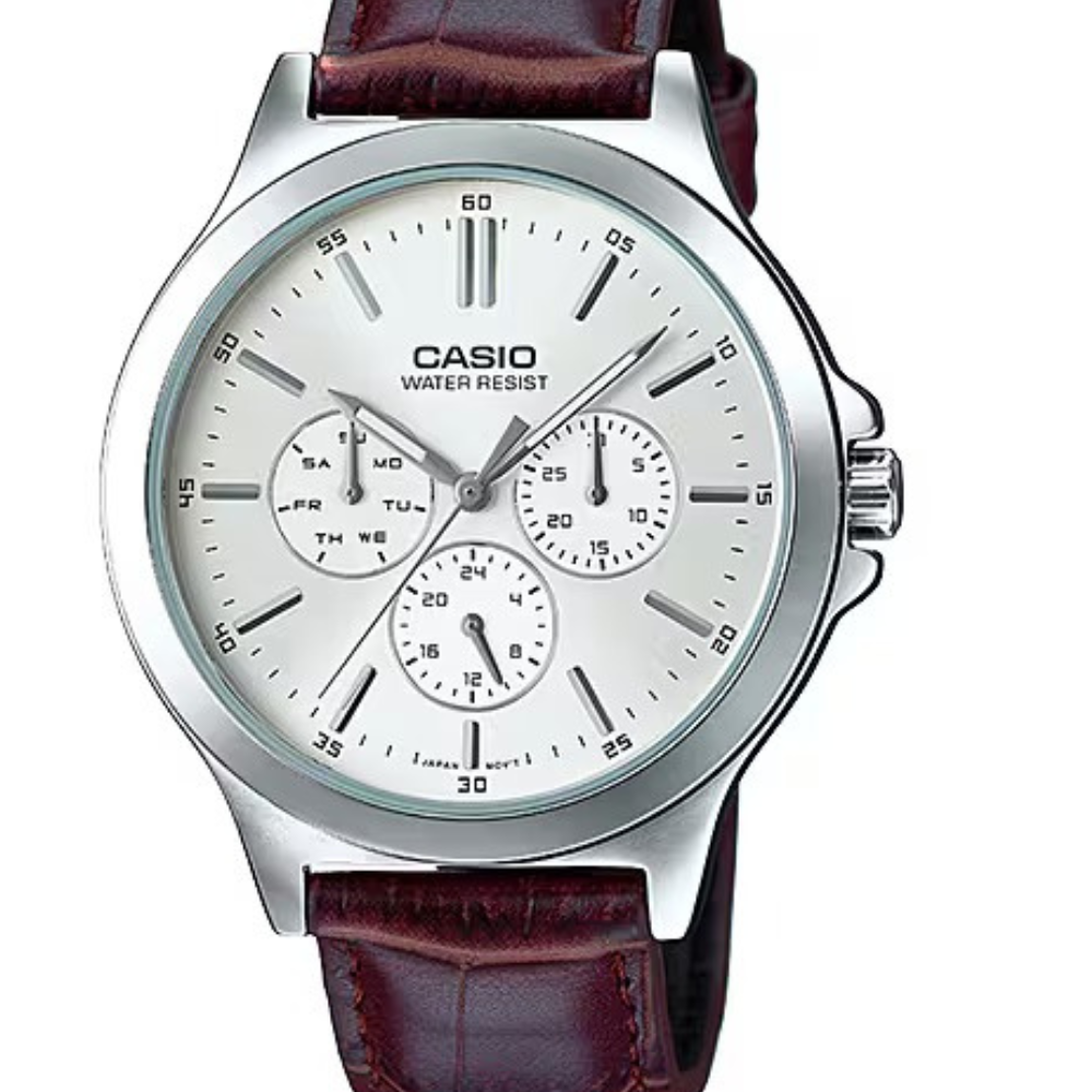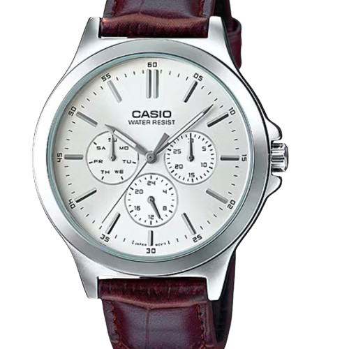 The Casio Enticer MTP-V300L-7AUDF is a versatile analog timepiece designed for men who appreciate a refined yet functional aesthetic. Featuring a crisp white dial with day, date, and 24-hour sub-dials, this multifunction watch offers more than just timekeeping — it’s a complete time management tool wrapped in elegant styling.