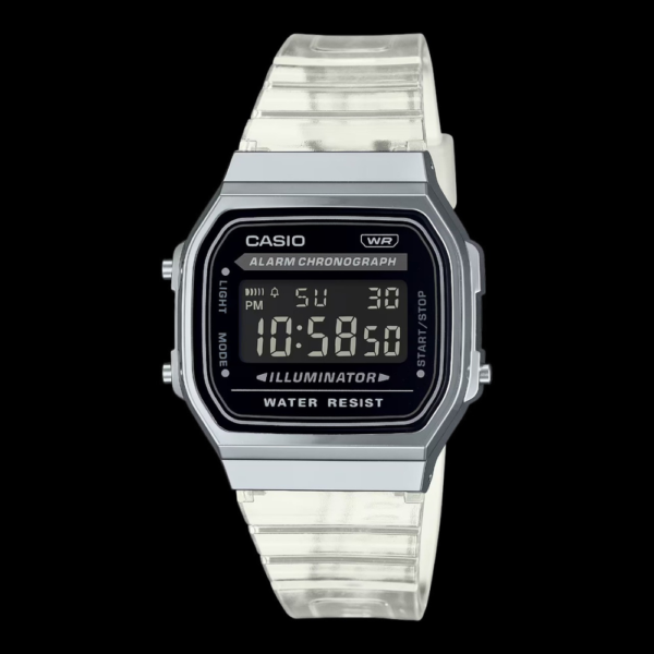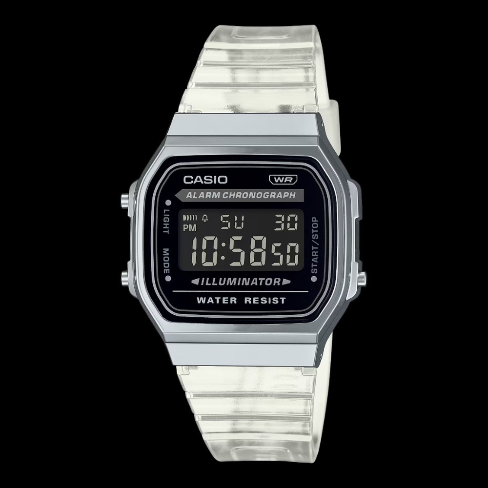 Step back in time with the Casio Vintage A168XES-1B, a fashionable tribute to 80s digital watch design. This eye-catching timepiece combines a chrome-plated resin case with a sleek, translucent resin band for a unique and modern twist on a classic look. Compact yet bold, it measures 39.4 × 36.3 × 9.7 mm and weighs just 25g—making it ideal for daily wear without weighing you down.