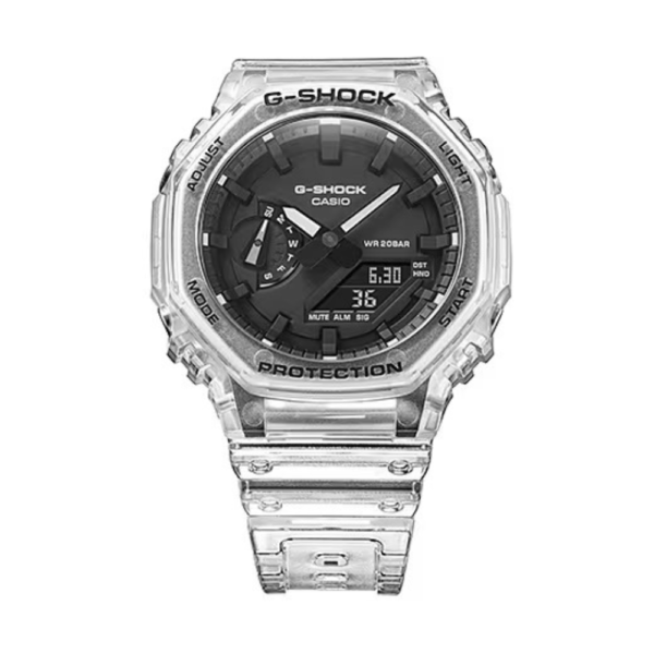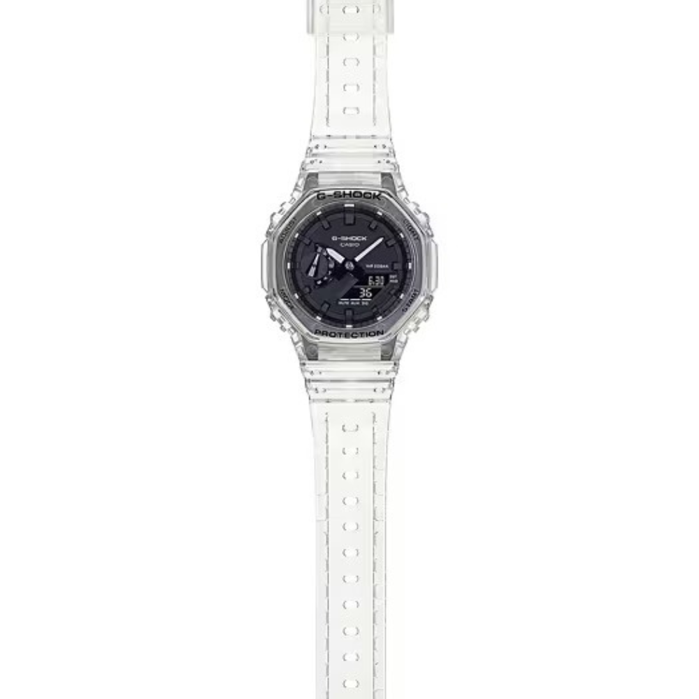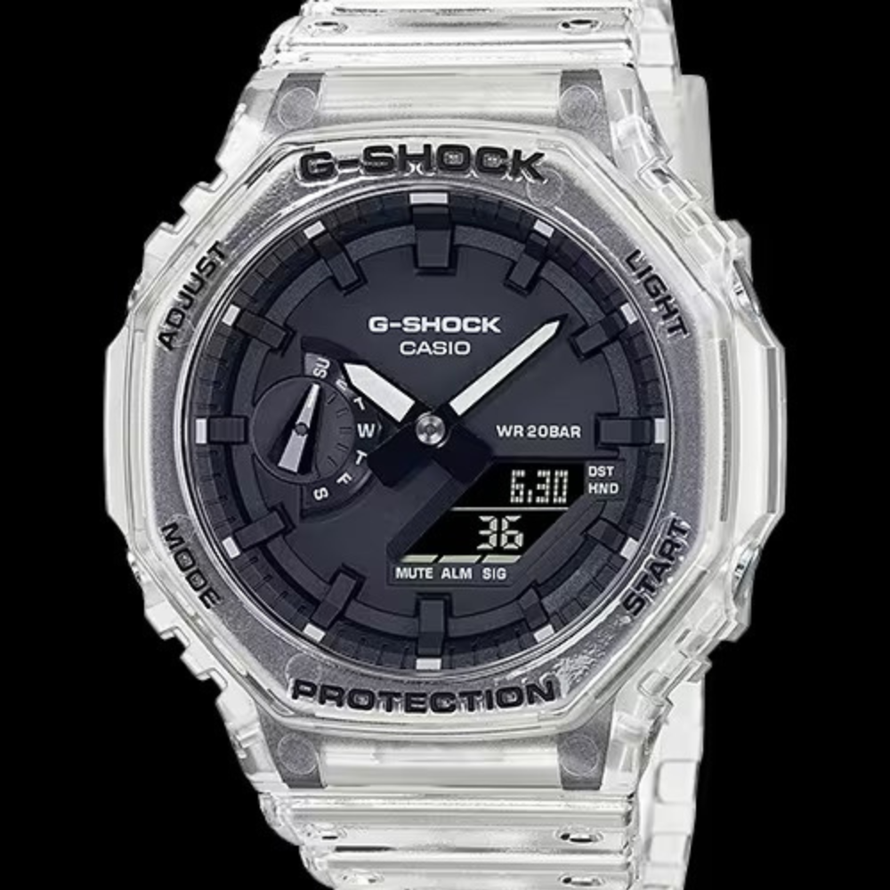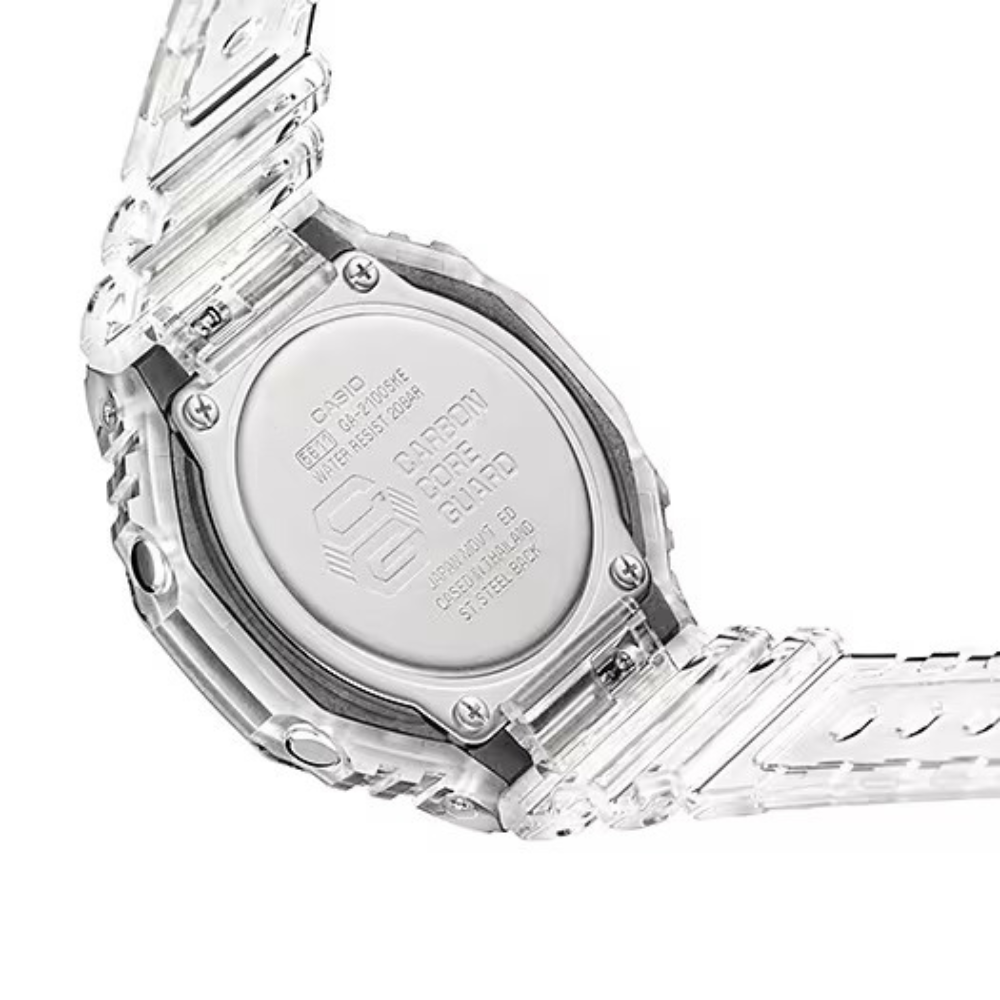 Step into the future of rugged style with the G-SHOCK GA-2100SKE-7A, part of the edgy Skeleton Series. Featuring a clear resin band and case components, this watch showcases G-SHOCK’s renowned durability with a fresh, urban twist.